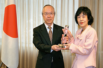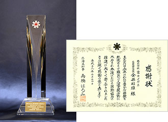 高橋はるみ北海道知事から授与された感謝状とクリスタルのトロフィー