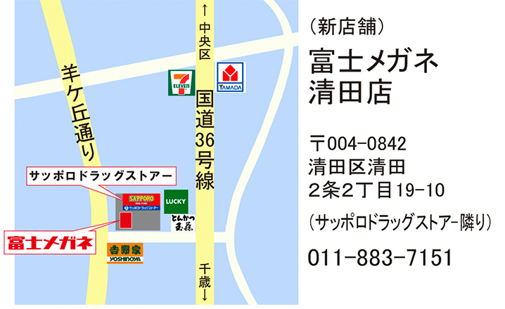 旧『富士メガネ清田ヤマダデンキ店』がヤマダデンキより退店し、6月24日(金)に独立店舗『富士メガネ清田店』として「サッポロドラッグストアー清田2条店」隣りに移転オープンいたしました。