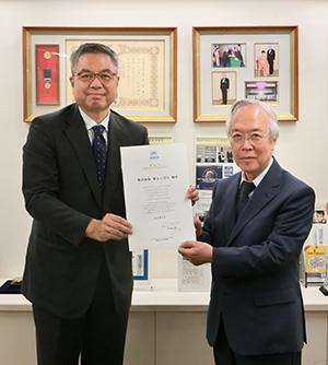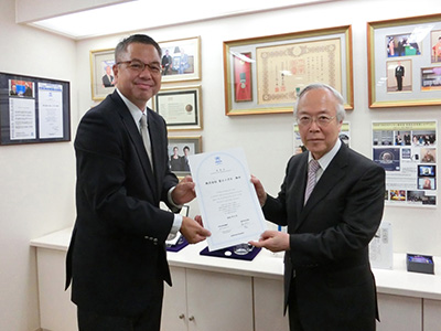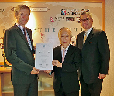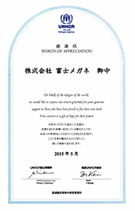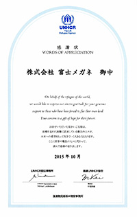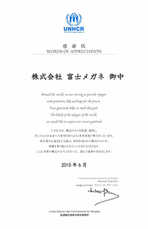 - UNHCRへのネパール大地震被災者緊急支援の寄付(5/8、10,000米ドル)に対するUNHCR駐日事務所マイケル・リンデンバウアー代表、特定非営利活動法人 国連UNHCR協会・甲斐幹敏理事長連名の感謝状が国連UNHCR協会・檜森隆伸事務局長から会長・金井昭雄O.D.に伝達される(於:本社・応接室)