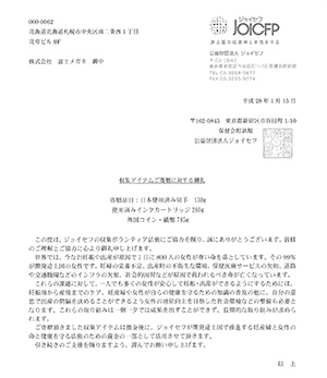 公益財団法人ジョイセフ(JOICEFP:Japanese Organization for International Cooperation in Family Planning、開発途上国で妊産婦と女性の命と健康を守る活動を実施する国際NGO)に当社が収集したインクジェットプリンターの使用済みインクカートリッジ、使用済み切手と当社お得意様からご寄贈いただいた外国コインを寄贈(宅配便で発送)